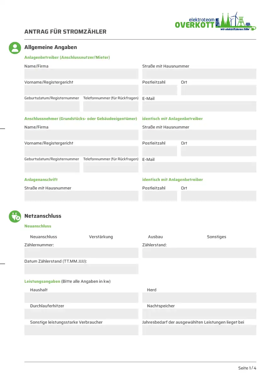 Mit diesen Daten können wir bereits in den meisten Fällen eine Voranfrage stellen. Hier zu ist es wichtig uns die unterschrieben Vollmacht, am Ende dieser Seite, zukommen zulassen. Wenn wir dann noch Fragen haben oder weiter ins Detail gehen müssen werden wir uns über Ihre Kontaktdaten melden. (Bitte soviel wie möglich ausfüllen, keine Pflichtfelder, nur Vollmacht ist nötig für Kontaktaufnahme VNB VerteilNetzBetreiber).